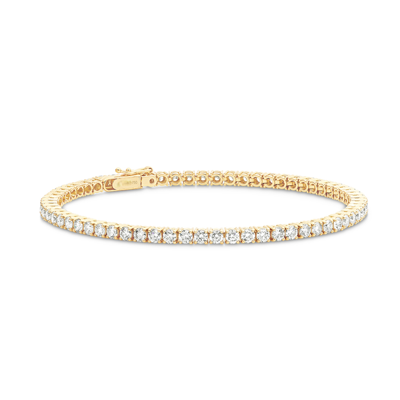 Elevate your style effortlessly with this 18K Yellow Gold classic diamond tennis bracelet. A must have and perfect for all occasions. Crafted in 18K Yellow Gold, featuring round brilliant cut diamonds in a claw setting. A perfect gift to yourself or a loved one, celebrating special moments and creating memories that last a lifetime. • Style: Tennis Bracelet • Clasp: Box Clasp with Security Clip • Metal: 18K Yellow Gold • Finish: High Polished • Gemstone: I-J, VS-SI Natural Diamonds (46 x 3.8mm) • Gemstone Shape: Round Brilliant Cut